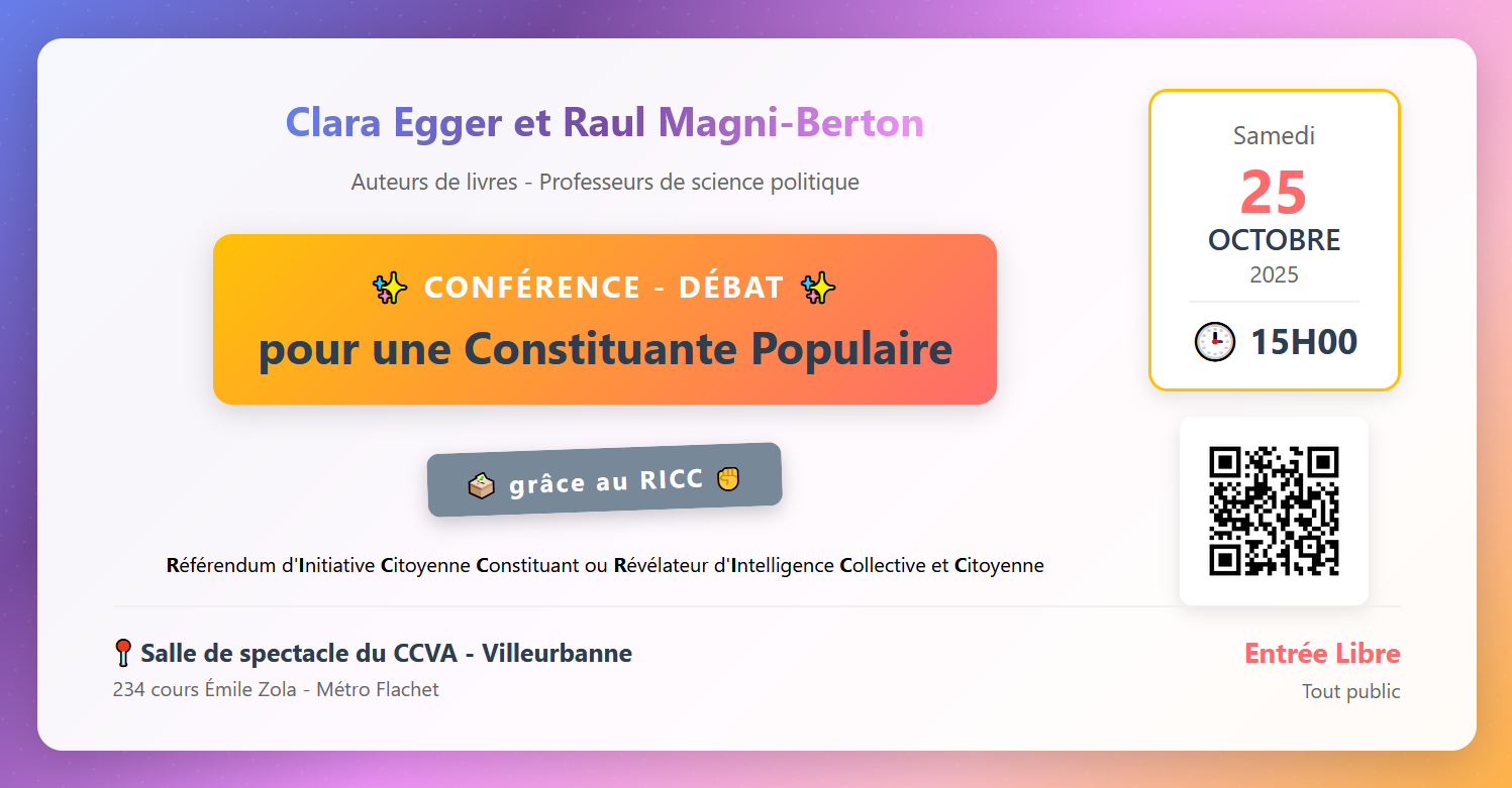 C’est la promesse du RICC – le RĂ©fĂ©rendum d’Initiative Citoyenne Constituant. Une rĂ©volution dĂ©mocratique pacifique expliquĂ©e en dĂ©tail lors de la confĂ©rence historique du 25 octobre 2025 Ă Villeurbanne.